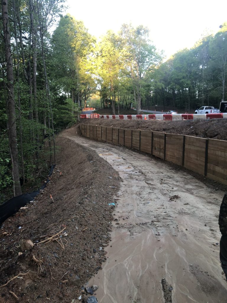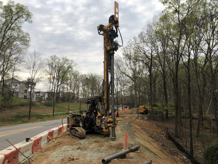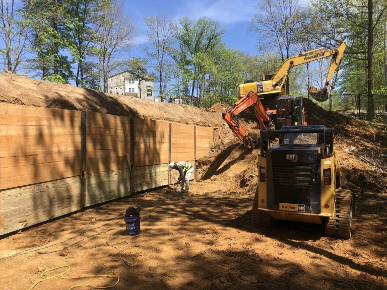 Taproot installed a temporary drilled casing and lagging wall to meet the project’s excavation support needs. The presence of shallow partially weathered rock (PWR) within the pile embedment zone presented drilling challenges that ruled out conventional soldier pile installation. Instead, Taproot utilized cased drilling methods to maintain hole integrity through the variable subsurface conditions, followed by timber lagging as excavation progressed in lifts.