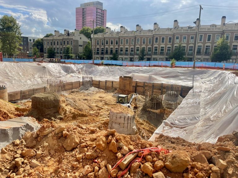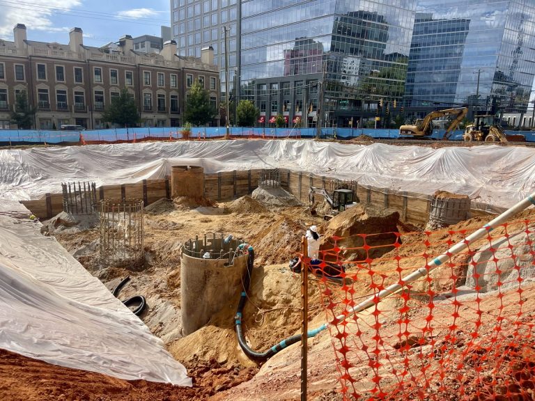 As part of the signature Queensbridge Collective development in Charlotte’s South End, Taproot Construction was selected to install a driven soldier pile and lagging wall supporting excavation for the foundation of Tower 1. The four-sided earth retention system was designed to accommodate construction of a 10-foot-thick mat footing that will support the new 42-story residential high-rise.